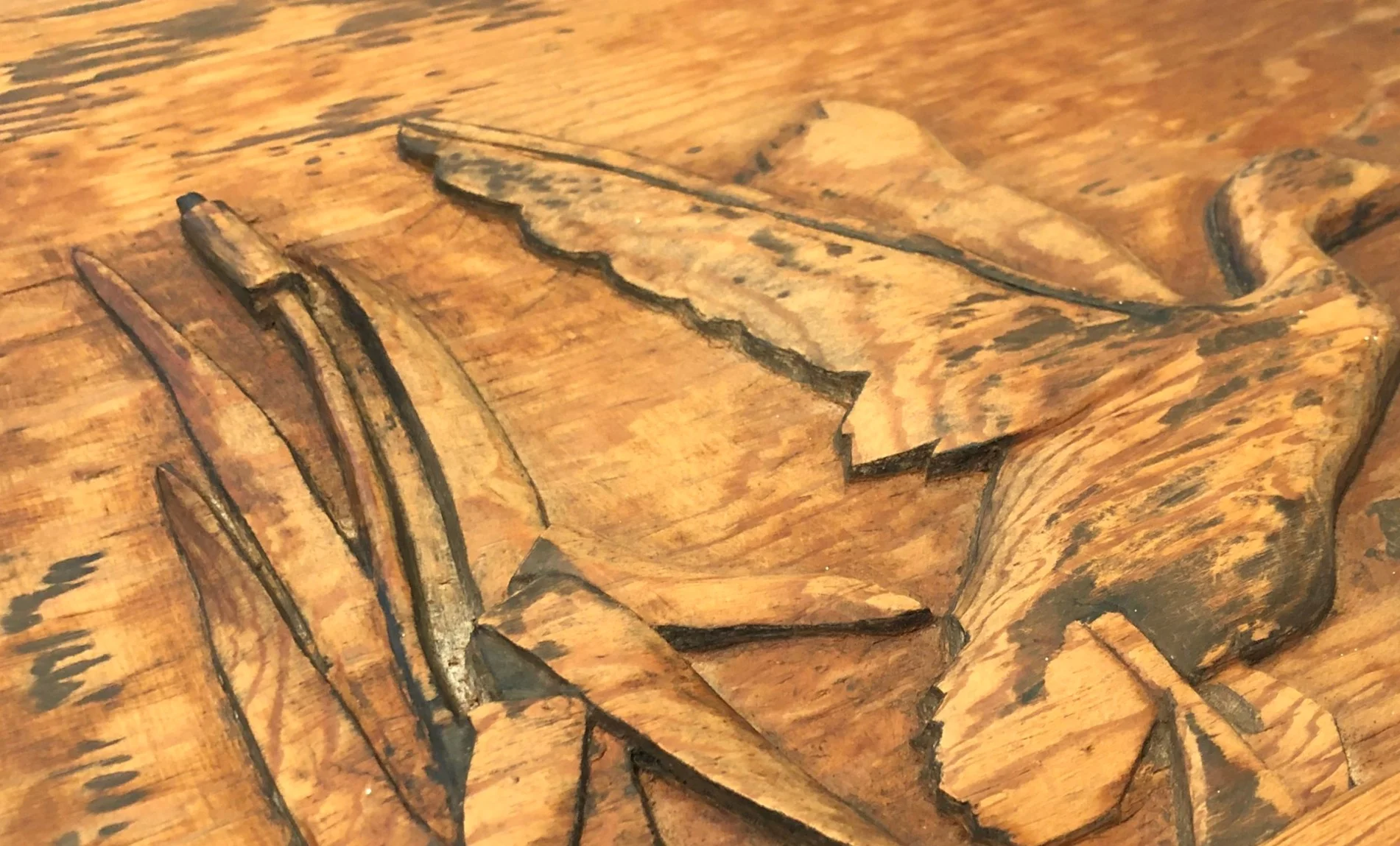 This statue was carved from a flawed and discarded gun stock from a friend of Matt’s. Hence the skewed stance. “Mother Mary” below was also from the same stock.
